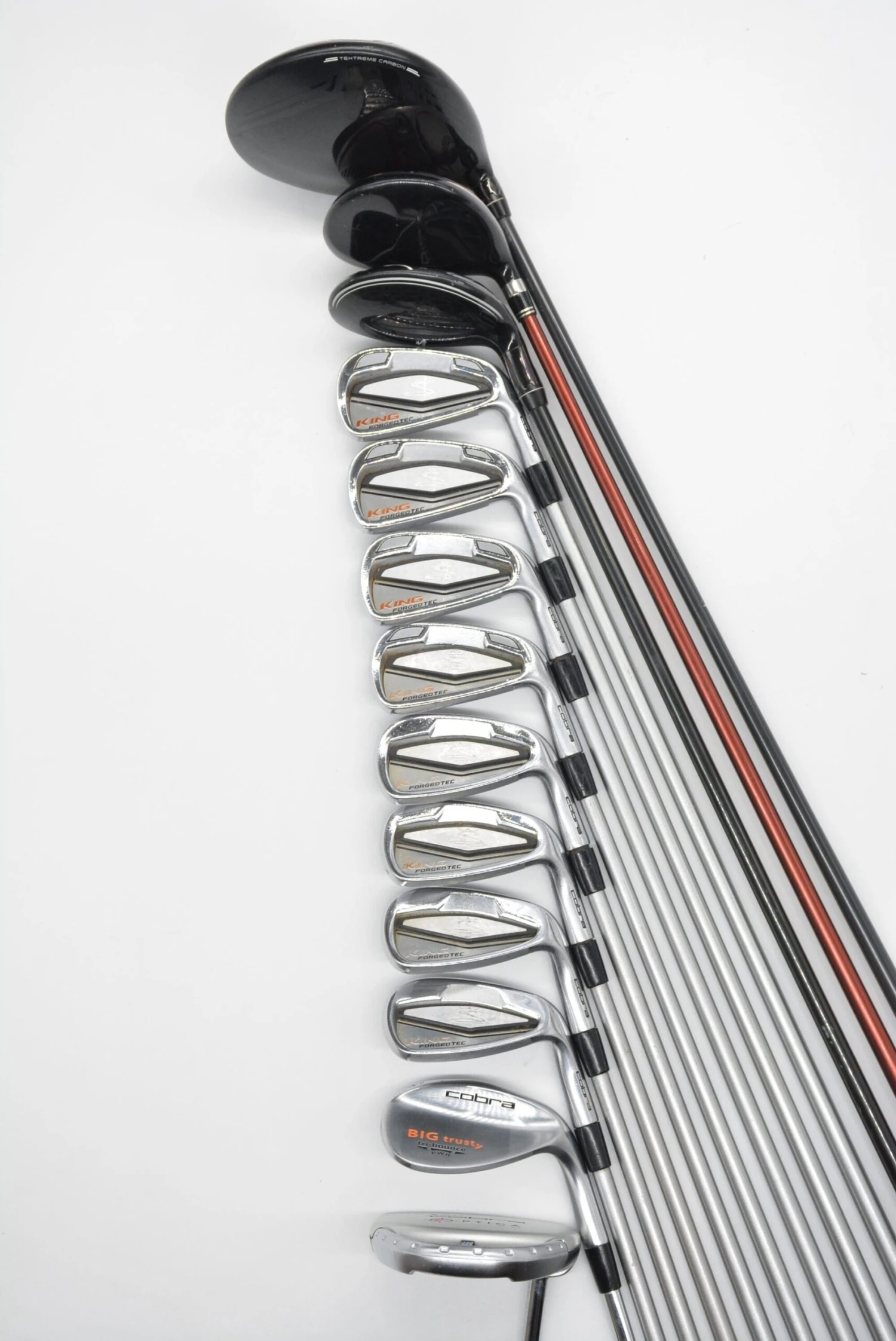 Set includes a Cobra King F7 9 degree Driver, a Cobra Speed LD F 5 Wood, a Cobra BioCell 4-5 Hybrid, Cobra King Forged Tec Irons 4-GW, a Cobra Big Trusty 55 degree wedge, and a Cobra Optica SI-01 33.5 in. Putter. Irons are in good condition with normal wear on the heads and faces, with KBS Tour shafts in R-flex and Golf Pride CP2 Pro grips.