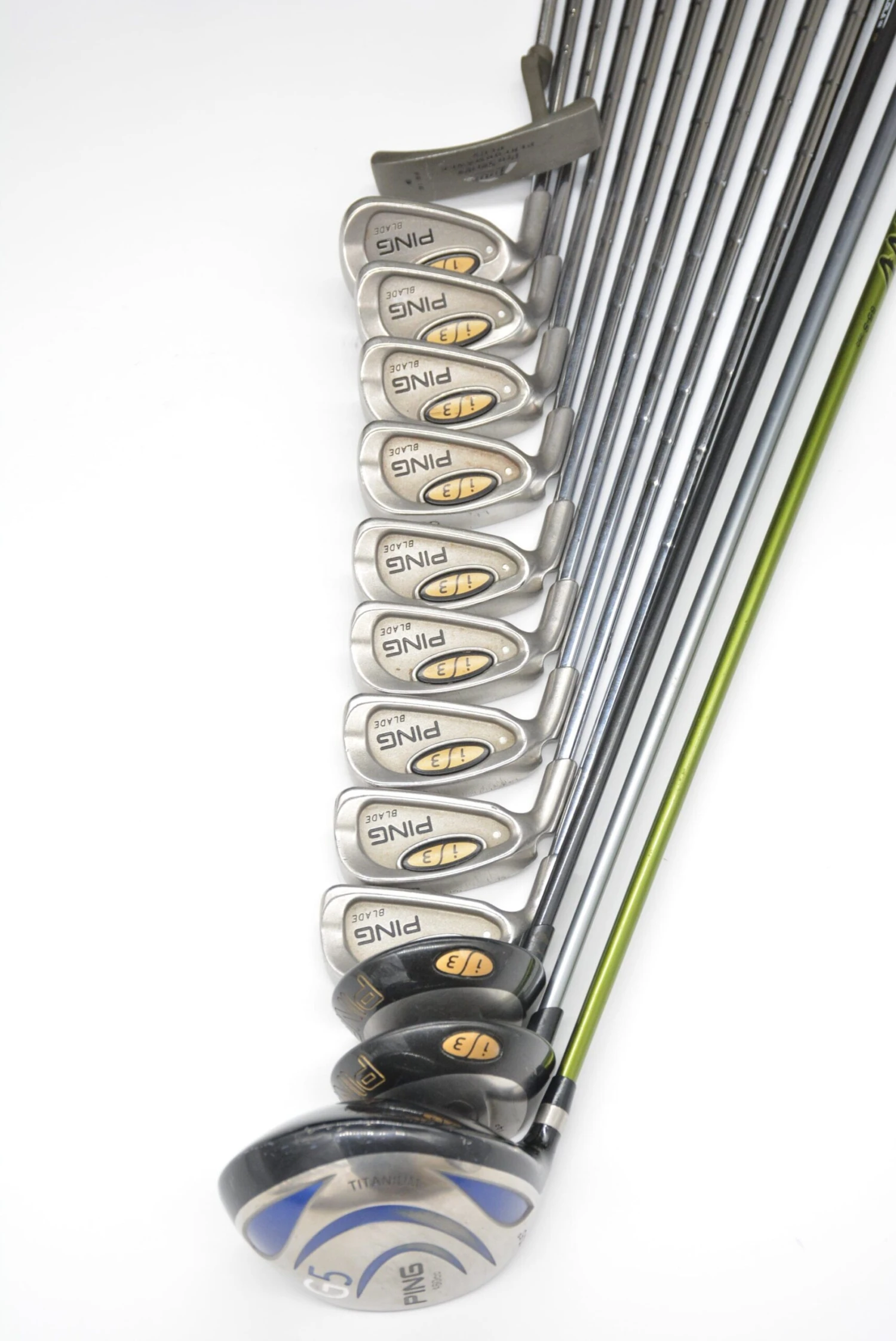 Set includes a Lefty Ping G5 10.5 degree Driver, Lefty Ping i3 3 and 5 Woods, Lefty Ping i3 Blade Irons 3-PW, and a Lefty Tour Technology Pro Series Performance Plus PR 16 35.5in. Putter. Irons are in good condition with light wear to the heads and faces, with stock S-flex shafts and Golf Pride MCC grips.