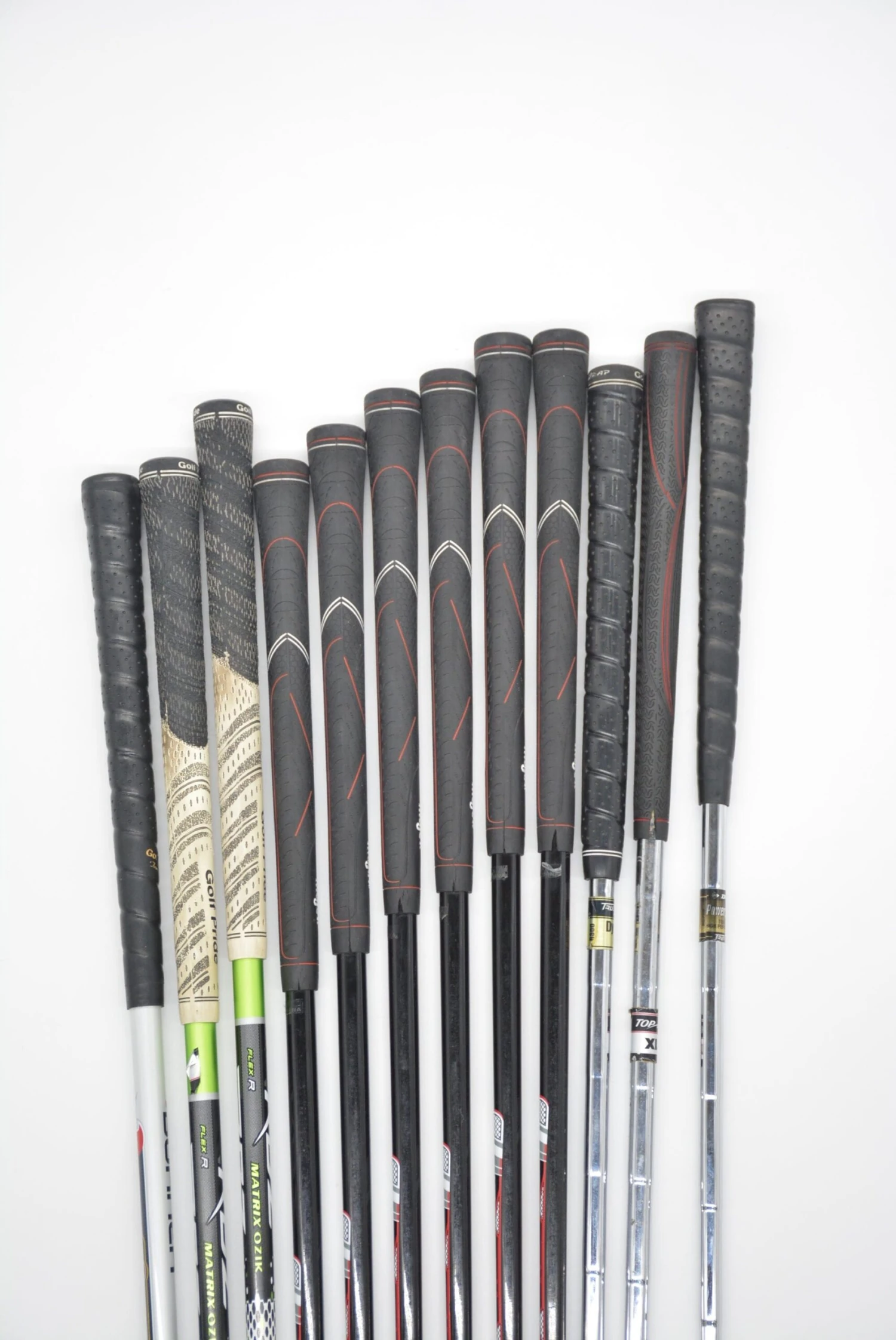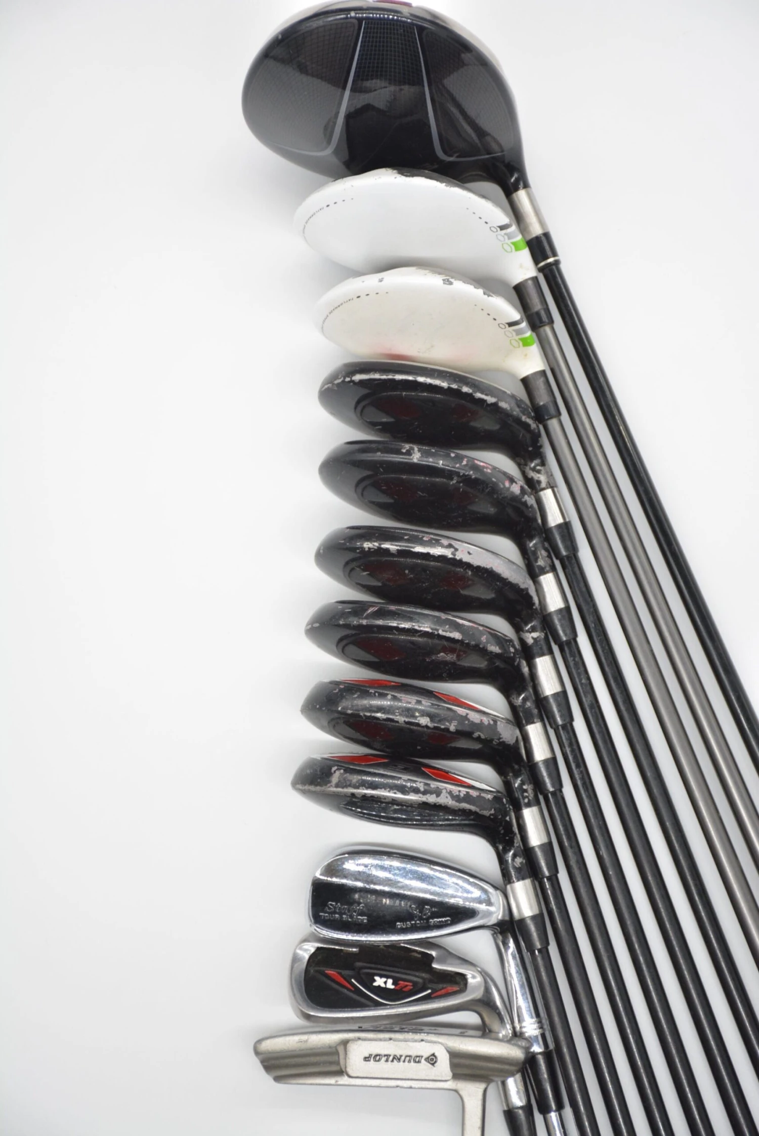 Set includes Taylormade 10.5 degree Burner HT, Taylormade RBZ 3 Wood, Taylormade RBZ 5 Wood, Majek K5S Hybrid Irons 3-9 (7 clubs), Top Flit XLT 5 Iron, Wilson Staff Tour Blade Pitching Wedge, and Dunlop Vista 34in Putter. Hybrid Irons are in fair condition with wear to the heads and faces as well as scratched paint (same goes for Woods) with stock shafts in SR flex with stock grips. Item #: 5973