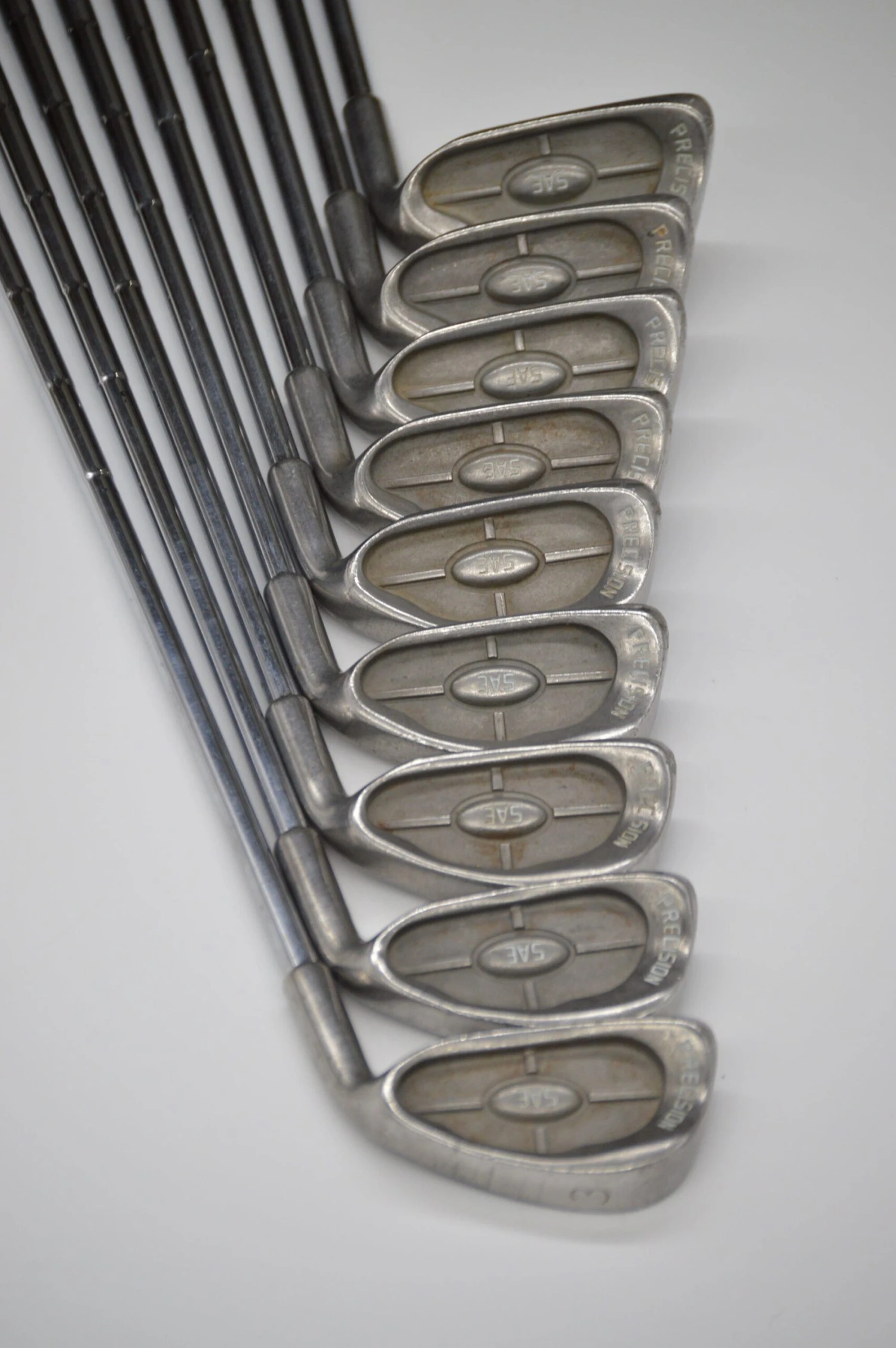 Set includes Precision SAE 3-PW, and SW. Irons are in good condition with light wear on the heads and faces. Shafts are stock steel in R flex with Lamkin Diamond grips.