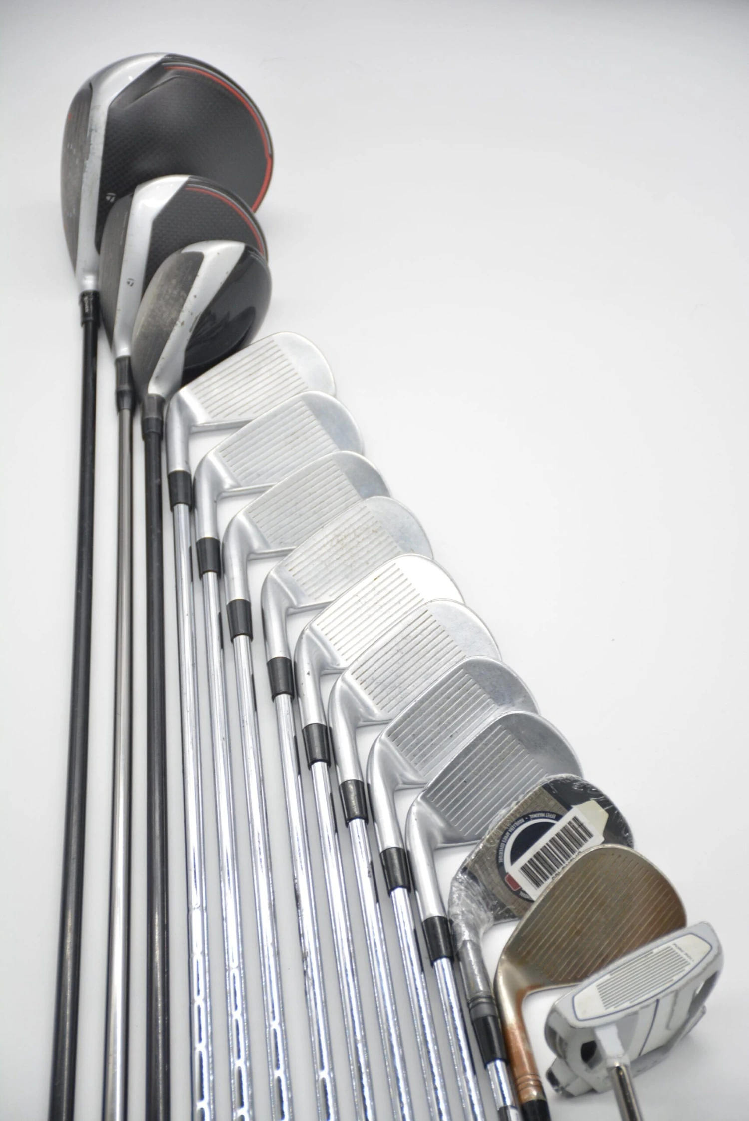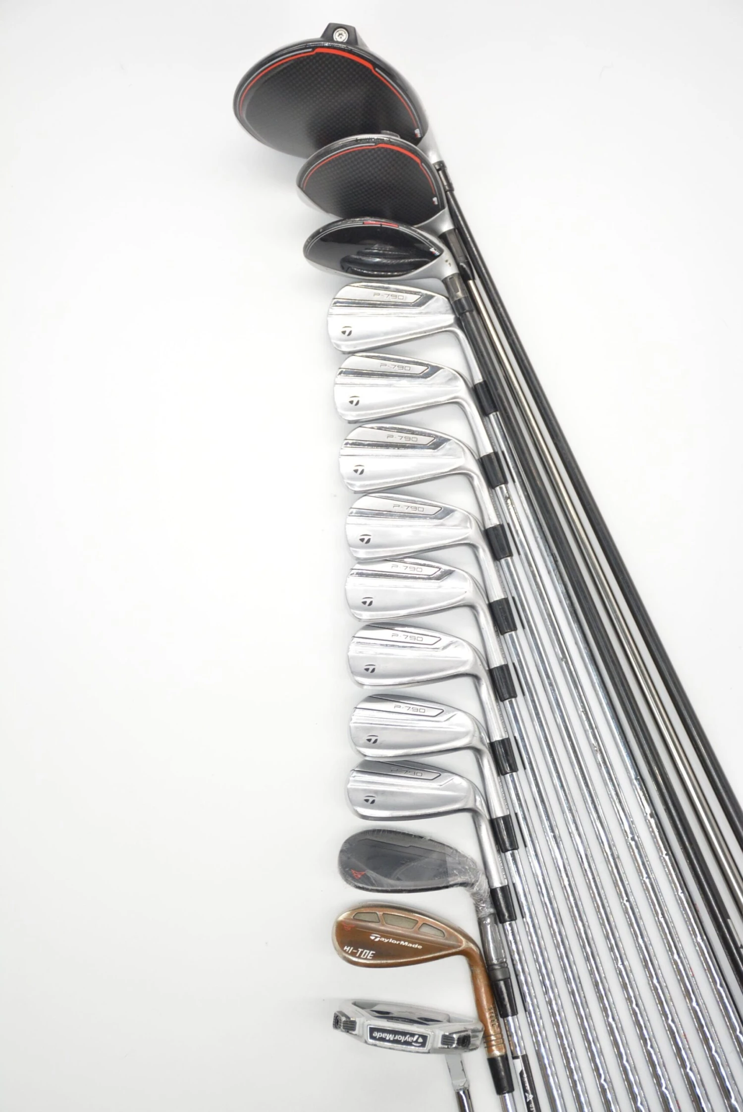 Set includes a TaylorMade M6 10.5 Degree Driver in fair condition, TaylorMade M6 16 Degree 3 Wood, TaylorMade M4 28 Degree 6 Hybrid, TaylorMade P790 4-AW Irons, brand new TaylorMade Black MG 54 Degree Wedge, TaylorMade MG Hi-Toe 58 Degree Wedge and a 35in TaylorMade Spider X Mallet Putter. Irons are in good condition with normal wear to the heads and faces. Iron shafts are N.S. Pro Modus 3 in R Flex with stock TaylorMade Golf Pride Tour Velvet grips.